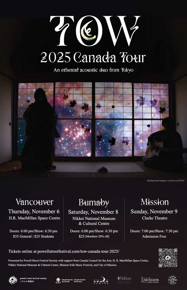 日本のアコースティック・デュオTOW(とう)のカナダ初公演となるツアーが、2025 年 11 月に開催されます。歌声、ギター、アコーディオンを融合させたシネマティックなサウンドで知られる TOW は、日本国内のみならず海外でも、幻想的かつ物語性に富んだ音楽で観客を魅了してきました。