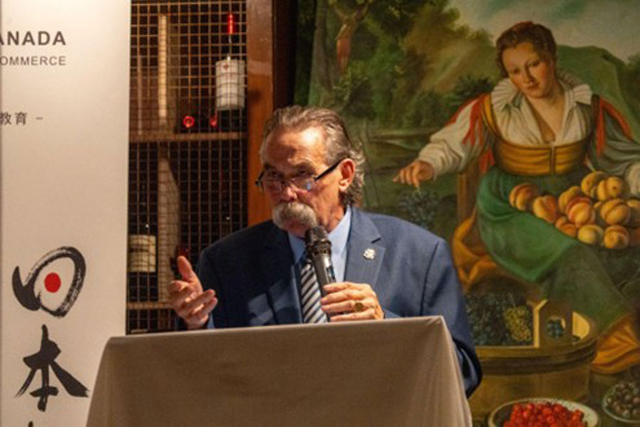 続いて、George Sim氏が自身の半世紀にわたる日本との交流をテーマにゲストスピーカーとして登壇。長年にわたり千葉市とノースバンクーバー市の青少年交流を通して姉妹都市活動に貢献してきた経験が紹介され、若者との文化交流にまつわる心温まるエピソードが共有されました。