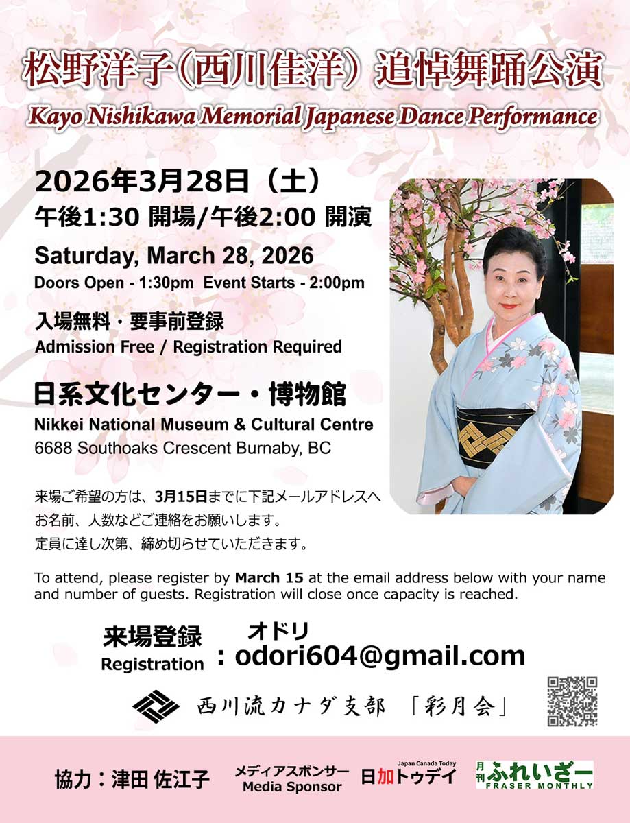 この度、西川流カナダ支部「彩月会」では、故・松野洋子(西川佳洋)を偲び、追悼舞踊公演を執り行う運びとなりました。